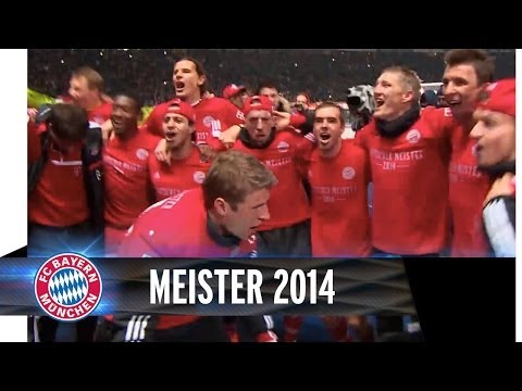 Team and fans sing "Deutscher Fußball-Meister FCB" together.